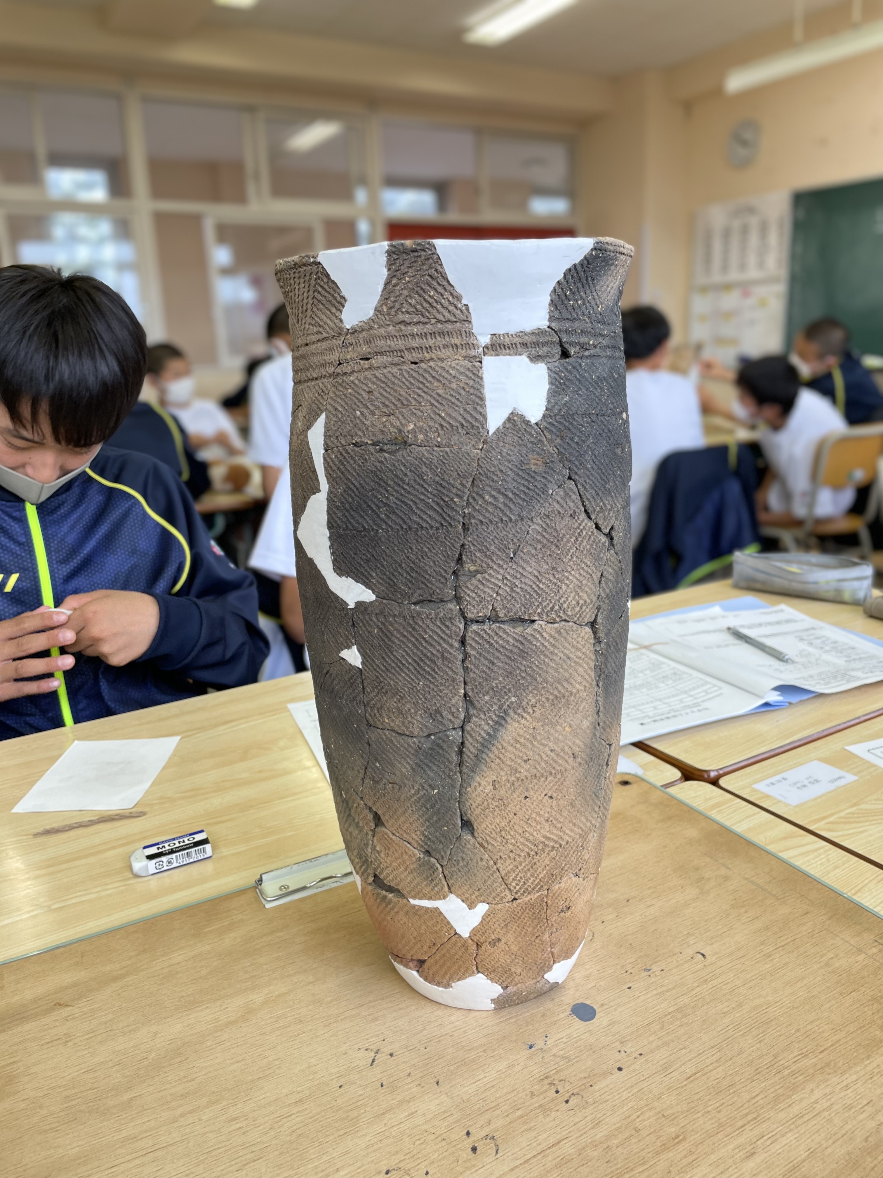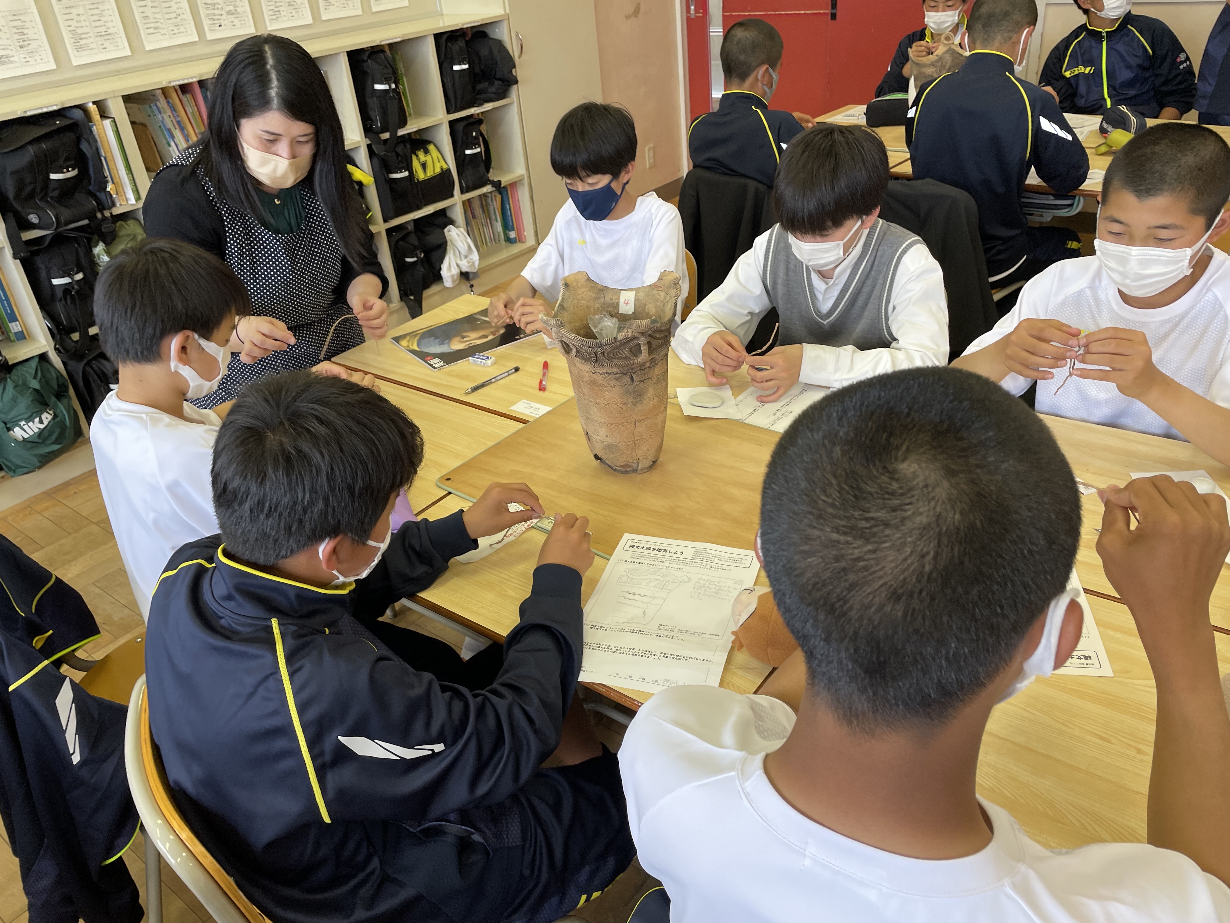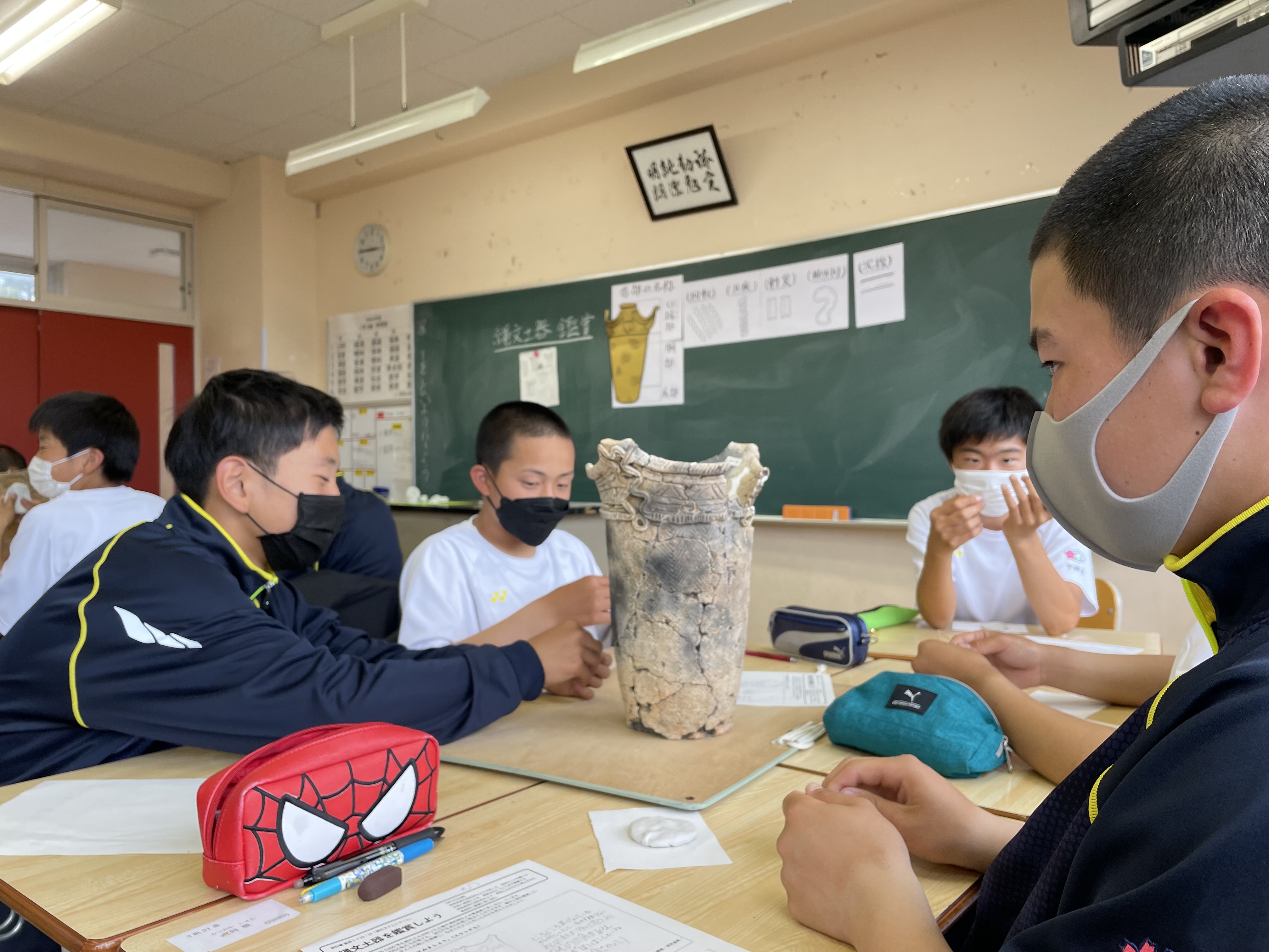 なかなか見ることのできない縄文土器を目の前に生徒たちは興味津々でした。