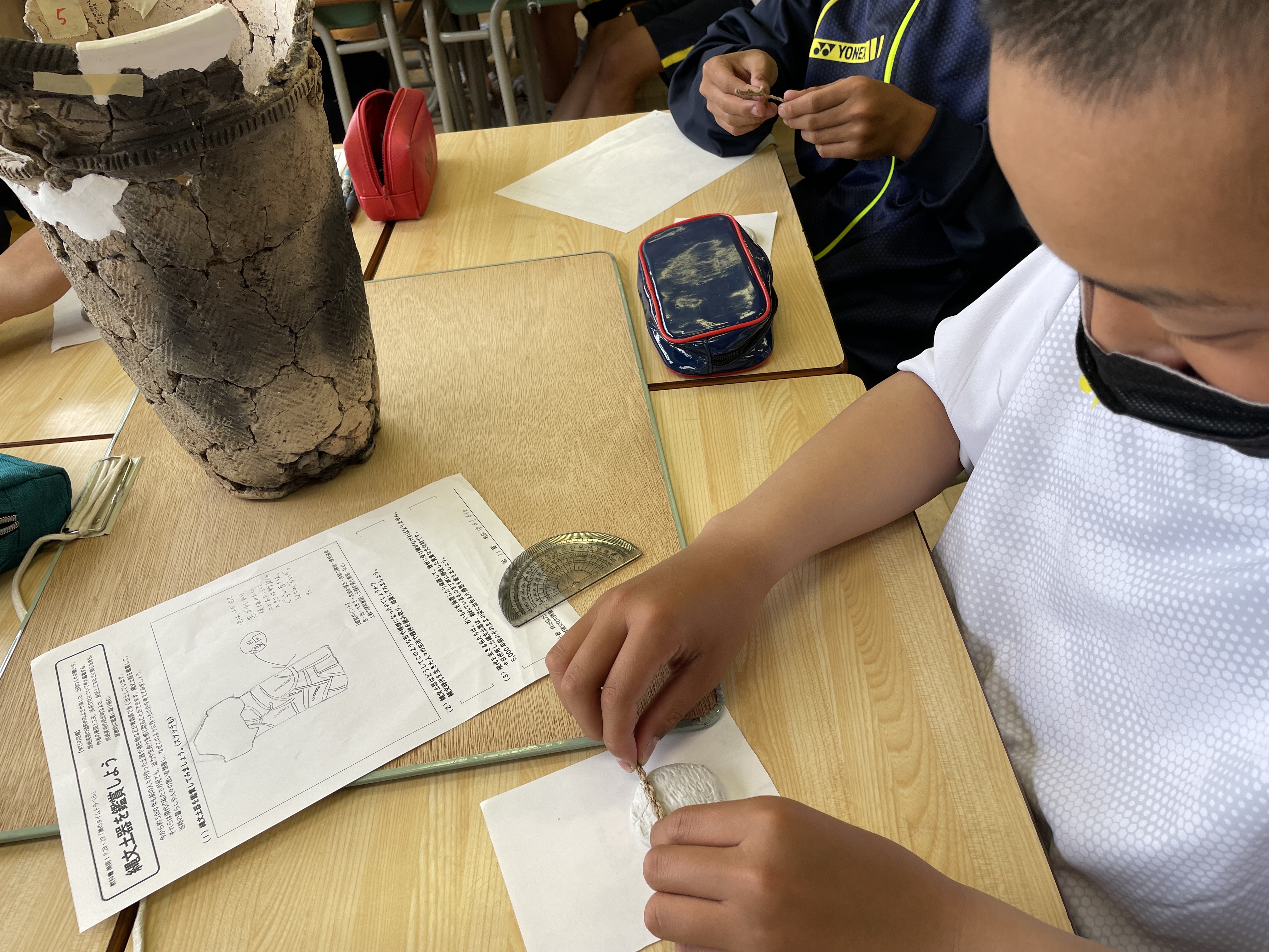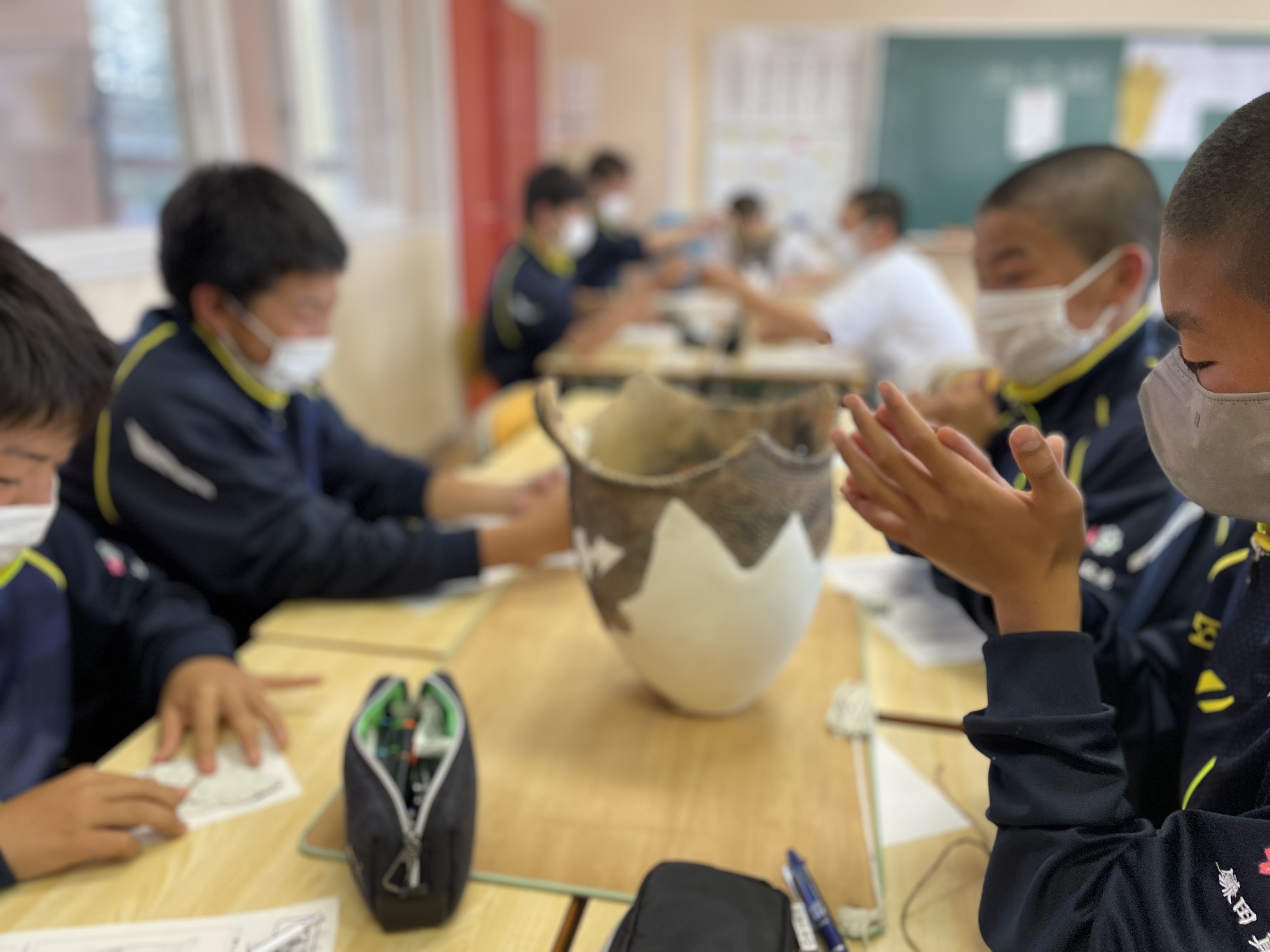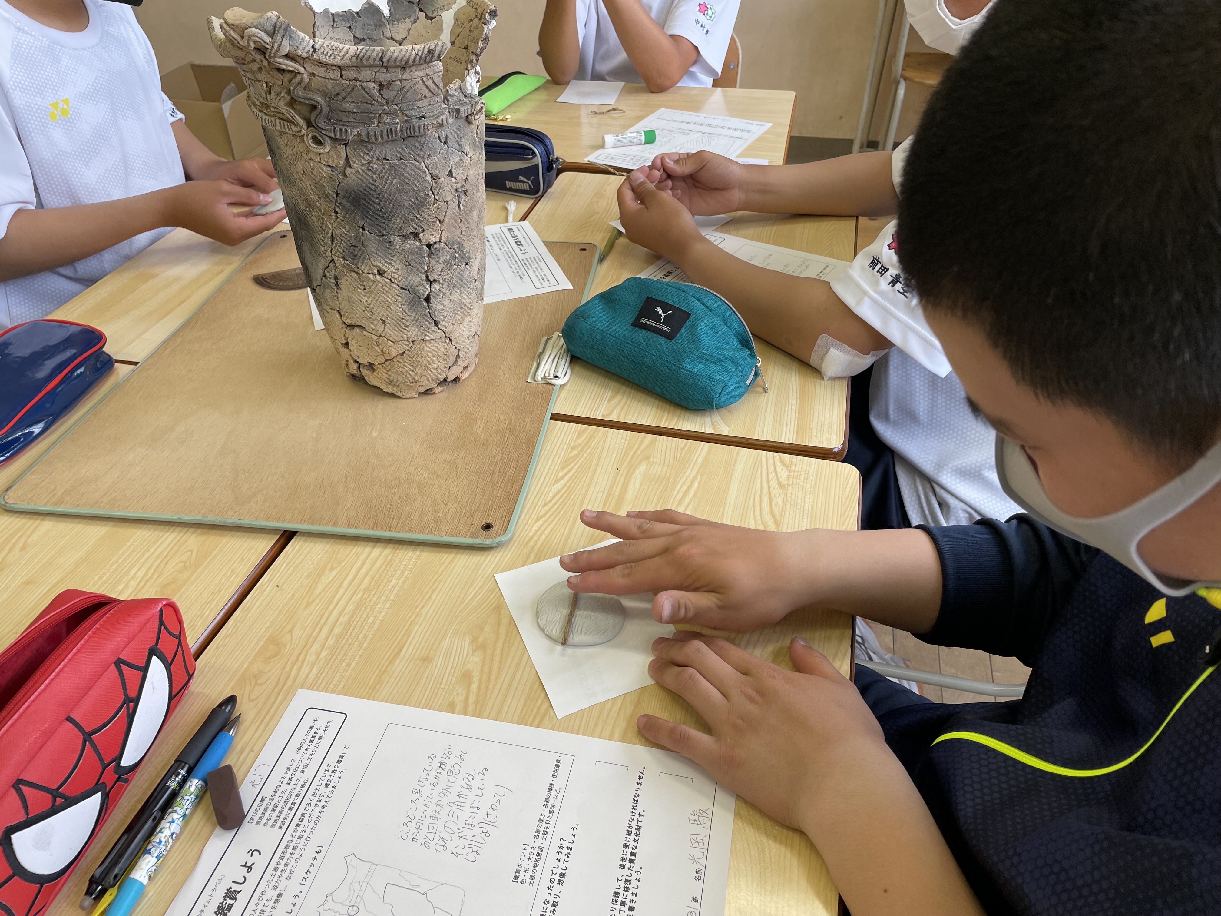 なかなか見ることのできない縄文土器を目の前に生徒たちは興味津々でした。
