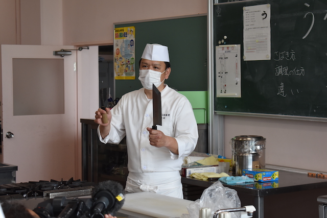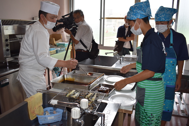 高校調理科の梅田先生より説明があり、ウナギのさばき方についてを学びました。
