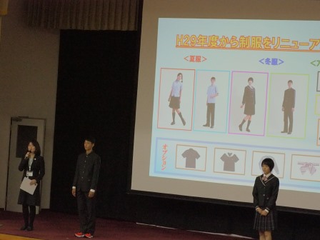 また、今年度よりリニューアルされた制服の紹介も行われ、制服の撮影のモデルとして協力してもらった生徒に登場してもらいました。