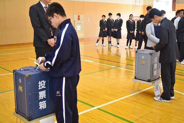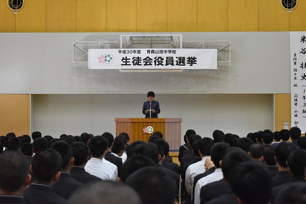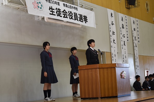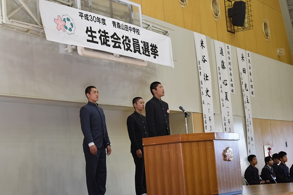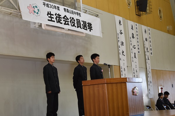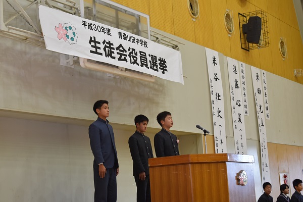 11月12日(月)に、平成30年度生徒会役員選挙が行われました。5名の立候補者が責任者と応援者とともに演説を行いました。1人1人が懸命に今後の青森山田中学校について語る姿に、生徒は真剣に耳を傾けました。