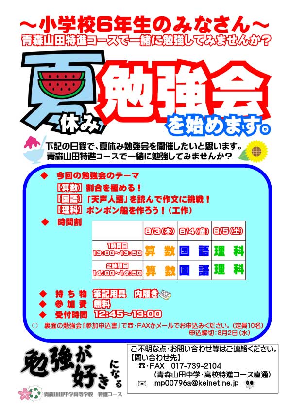 小学校6年生を対象に夏休み勉強会を実施します!!