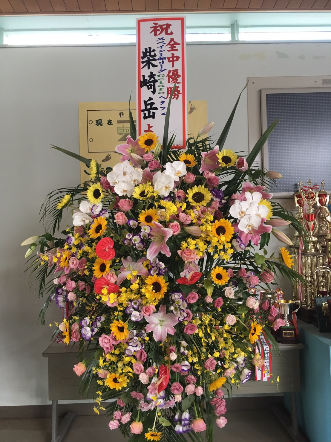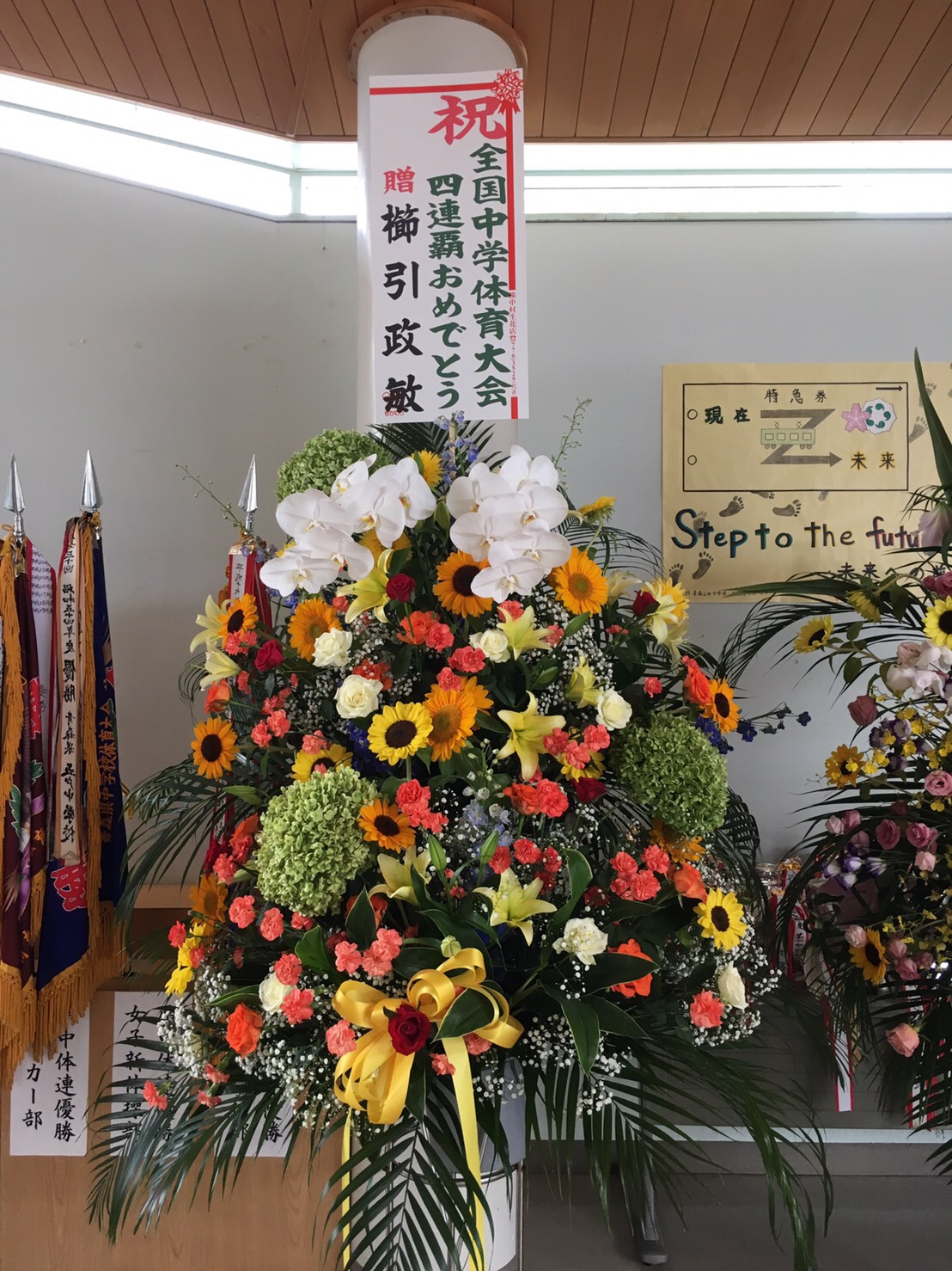 サッカー部の全国中学校サッカー大会優勝、史上初の4連覇を祝して、卒業生からお祝いのお花が届きました。