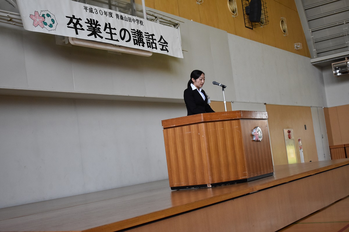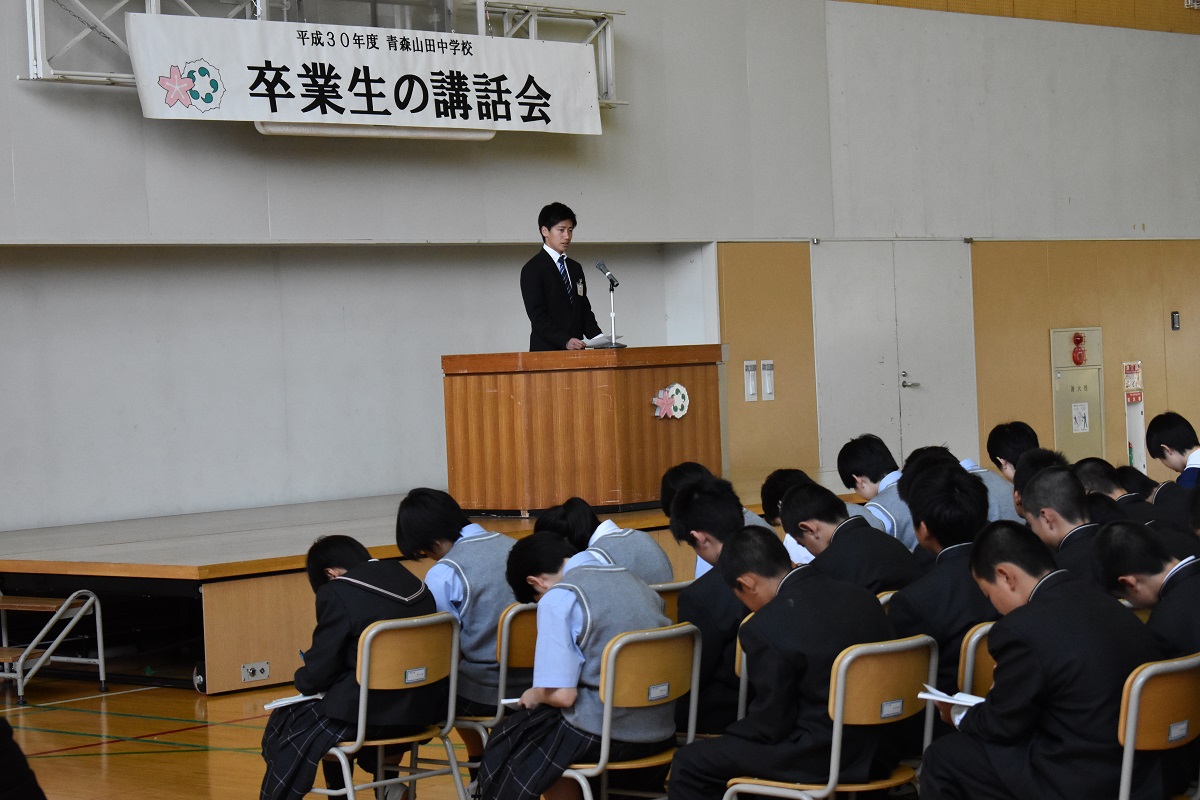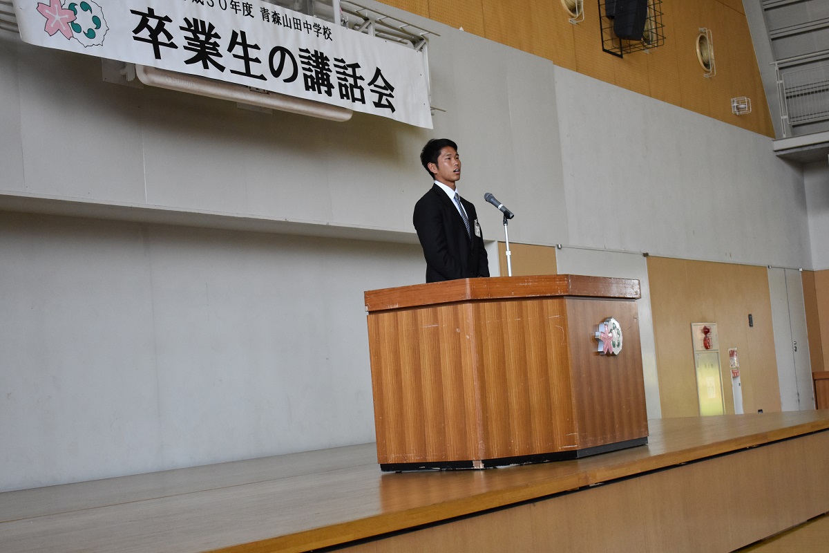 本日、5月21日(月)1時間目に中学校体育館にて卒業生講話が行われました。