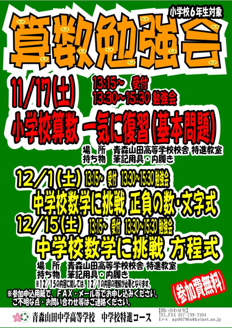 下記のメールアドレスに、青森山田中学高等学校特進コース「算数勉強会」に参加する旨と必要事項をご記入の上、送信して下さい。(決まった様式はありません)