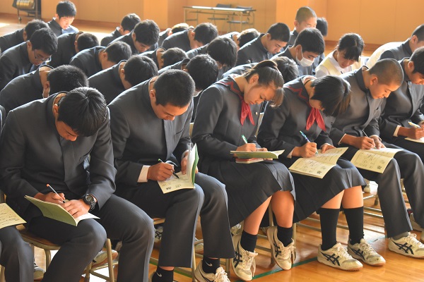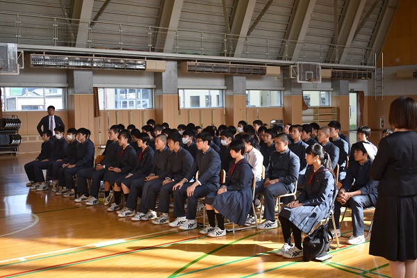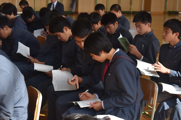 修学旅行委員長の三輪椋平君が、修学旅行のスローガンを発表しました。スローガンは、3年3組の瀬川あいさんが考えた「Memories~刻もう最高で最強の思い出」です。