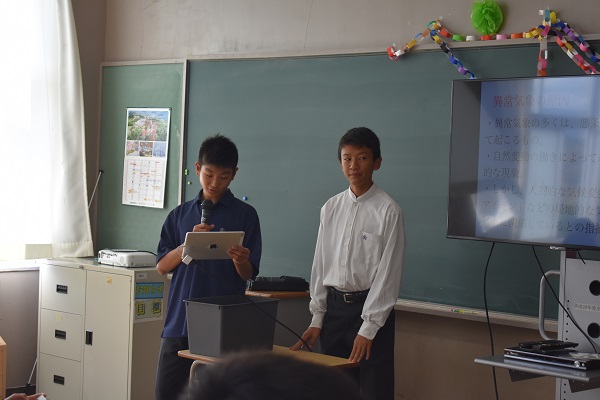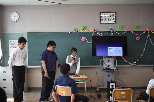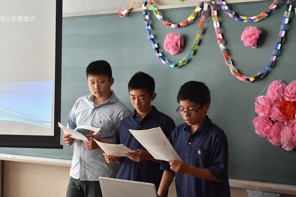 中学校特進コースでは、2年1組と3年1組がこれまでの総合的な学習の時間を使って行った調べ学習の発表会を行いました。