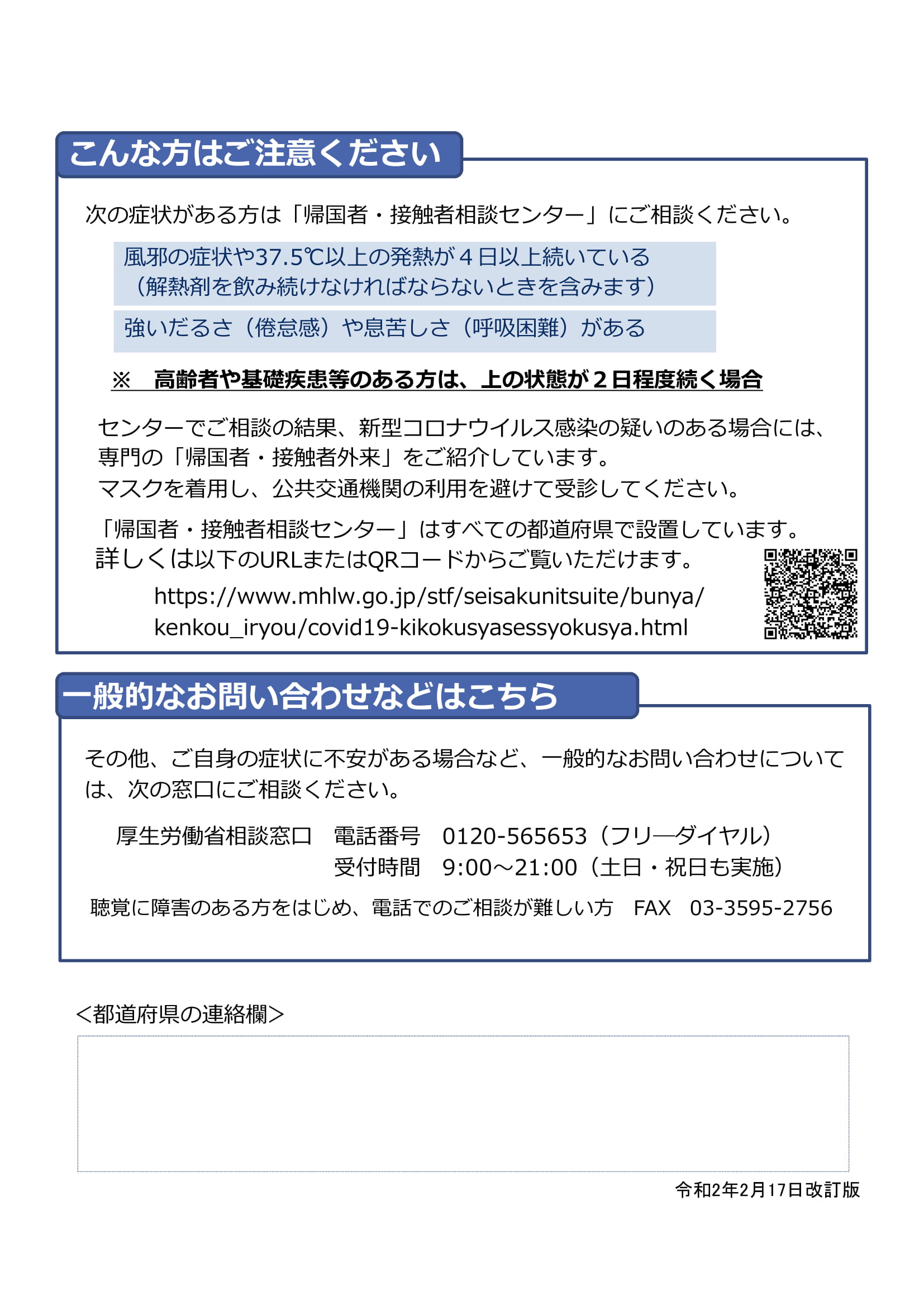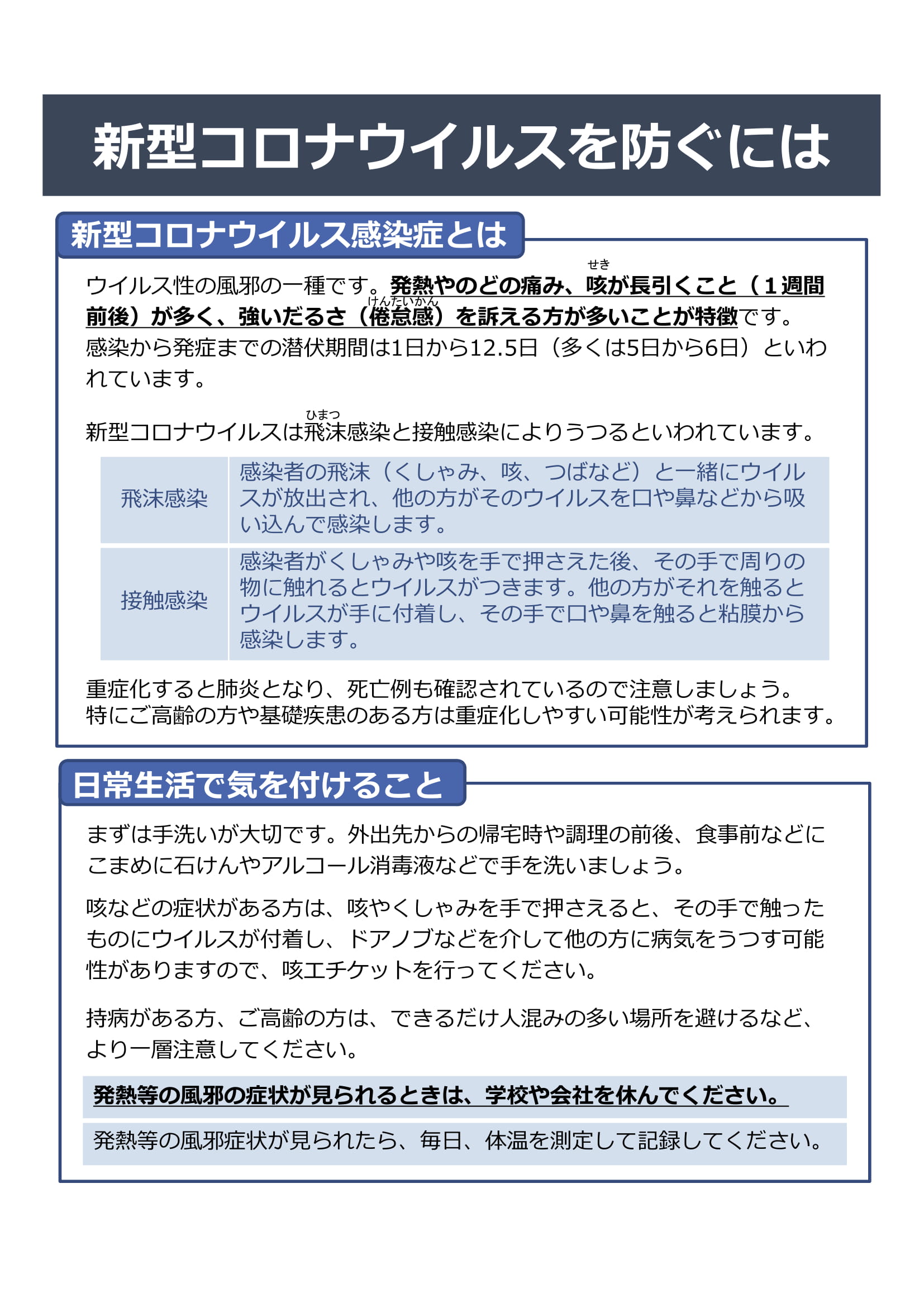 ウイルスの蔓延が懸念されている新型コロナウイルスについて、厚生労働省からの通達がありましたので、ご報告いたします。