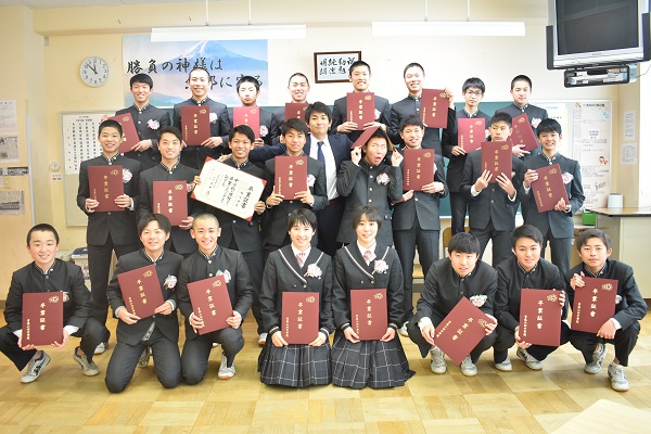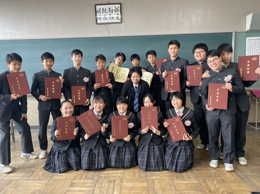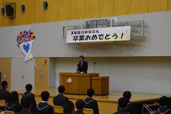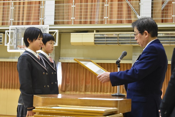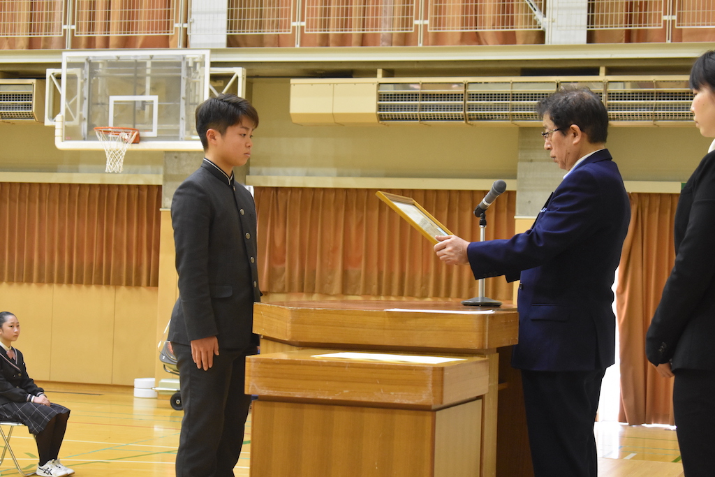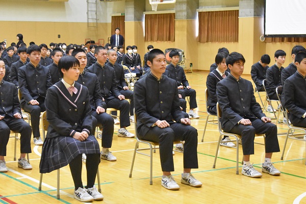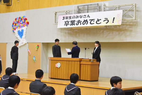 3月4日(水)に全校集会が行われ、3年生の卒業証書授与等も行われました。