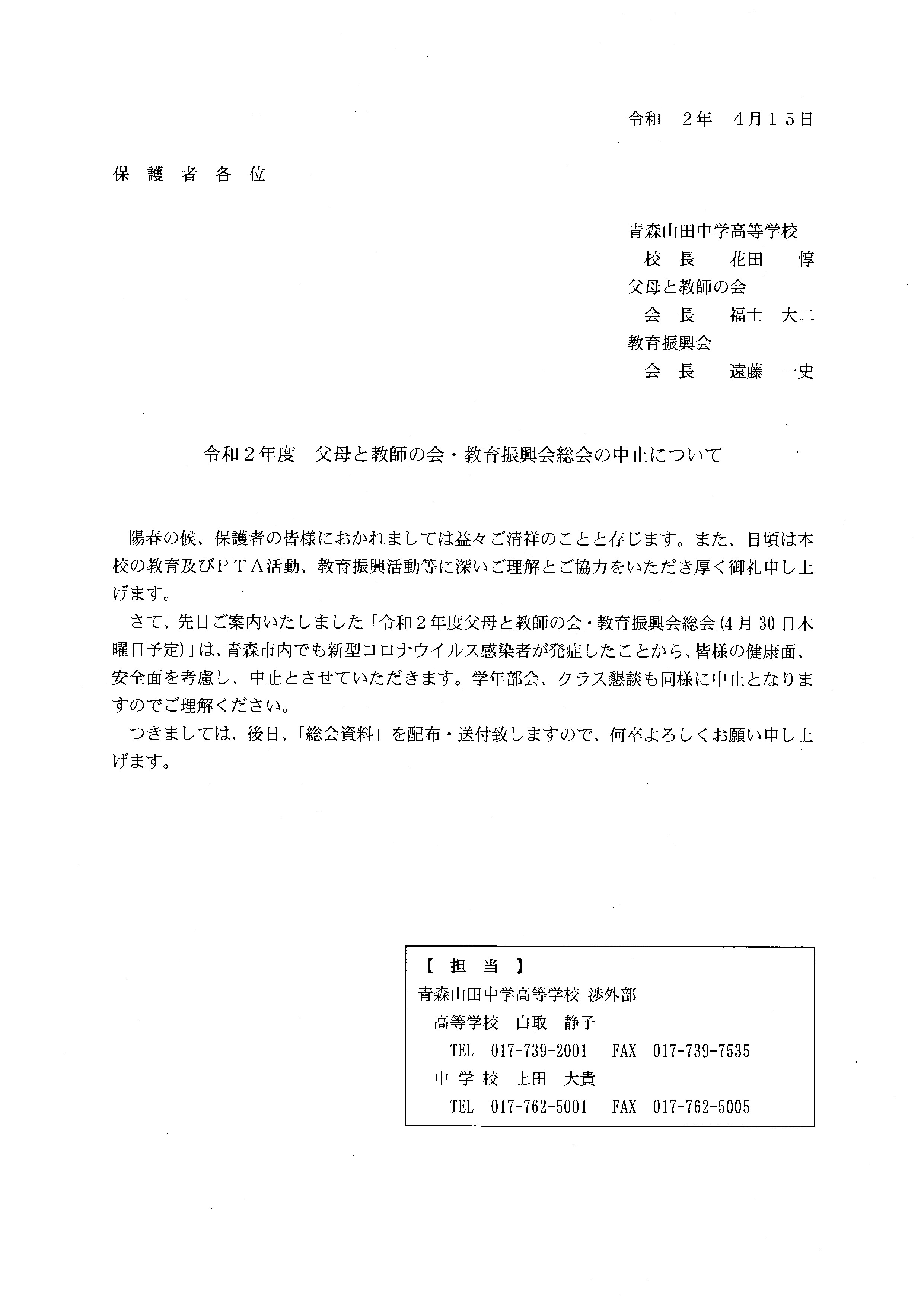 令和2年度 父母と教師の会・教育振興会総会の中止について