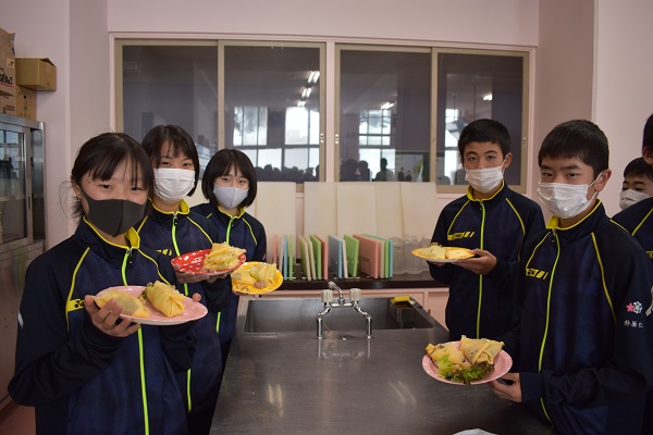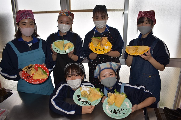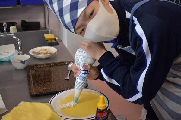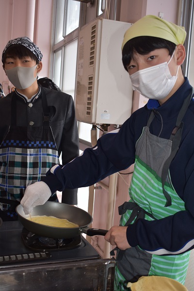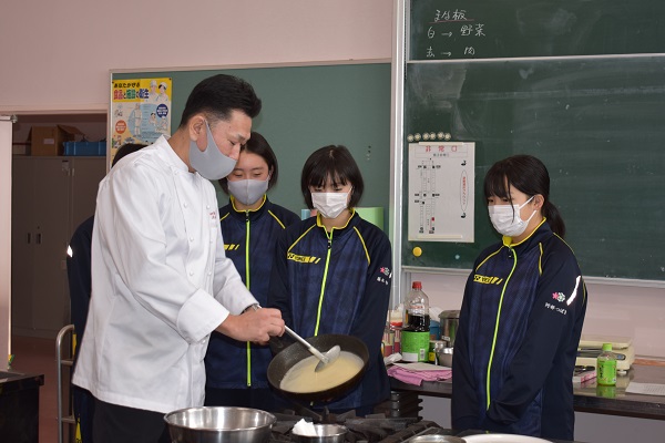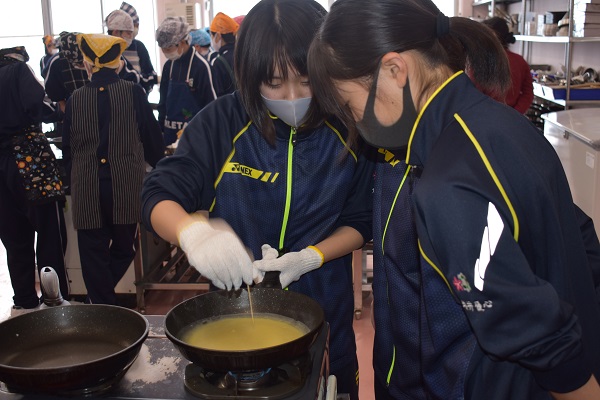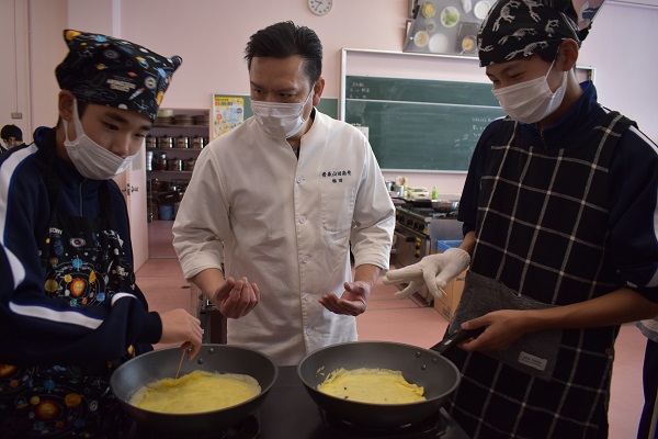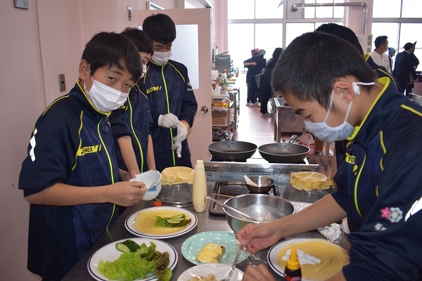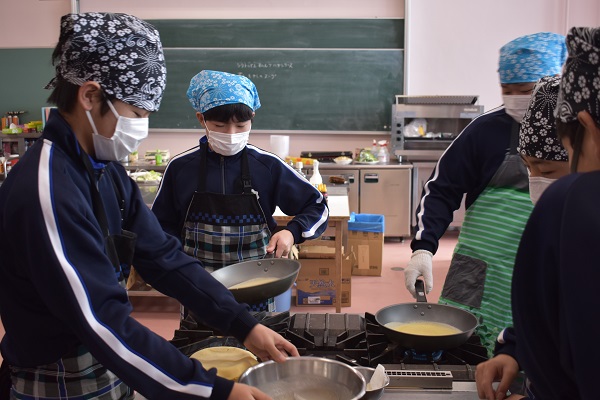 高校調理科の外川先生、有馬先生、梅田先生のご指導のもと、班ごとにクレープづくりに挑戦しました!